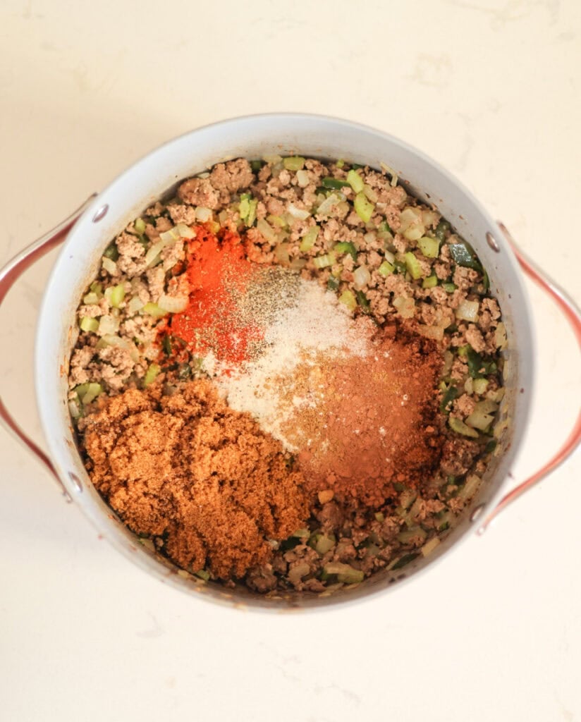 - Add seasonings. Sprinkle in the chili powder, cumin, salt, pepper, garlic powder, Italian seasoning, smoked paprika, brown sugar, onion powder, and cocoa powder. Stir well and cook for 30–60 seconds to bloom the spices.